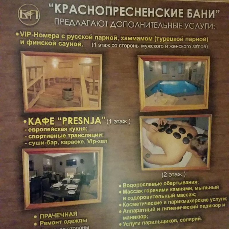 Отличные Бани, парная на высшем уровне, после ремонта стало уютно, комфортно, появился хамам, что даёт возможность в полной мере расслабится и переждать момент, пока готовится свежий пар, сотрудники приветливые, отзывчивые, всегда подскажут и помогут, если возникают вопросы!всем рекомендую Бани на Пресне!!!!